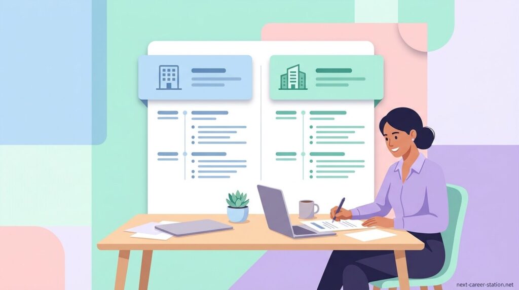 職歴が2社以上ある場合は、まず在籍したすべての会社を漏れなく並べます。そのうえで、業務内容が同じか違うかを基準に、まとめるのか会社ごとに分けるのかを判断します。2社の場合は直近の会社を中心に、担当範囲、件数、売上、達成率などを具体的な数字で示します。前職は成果に絞り、期間と代表的な実績を簡潔に記載します。