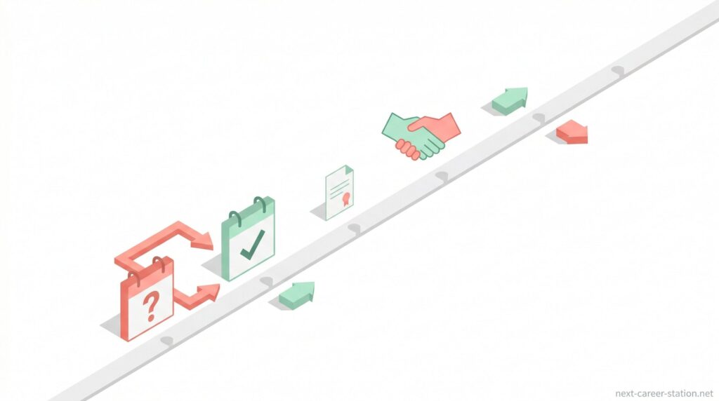 この記事では、中途採用の入社日が決まるタイミングや、希望をどこまで伝えられるのか、退職とのスケジュールをどう考えればいいのかを、順を追って説明していきます。