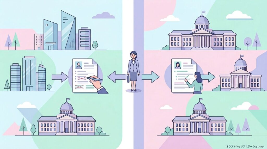 公務員応募といっても、これまでの立場によって職務経歴書の書き方は大きく変わります。民間企業から初めて公務員を目指すのか、すでに公務員として働いていて別の自治体や省庁に応募するのか、あるいは会計年度任用職員・非常勤として応募するのかで、強調すべき経験や整理の仕方が異なります。まずは自分がどの応募パターンに当てはまるのかを確認し、その立場に合った書き方を選びます。