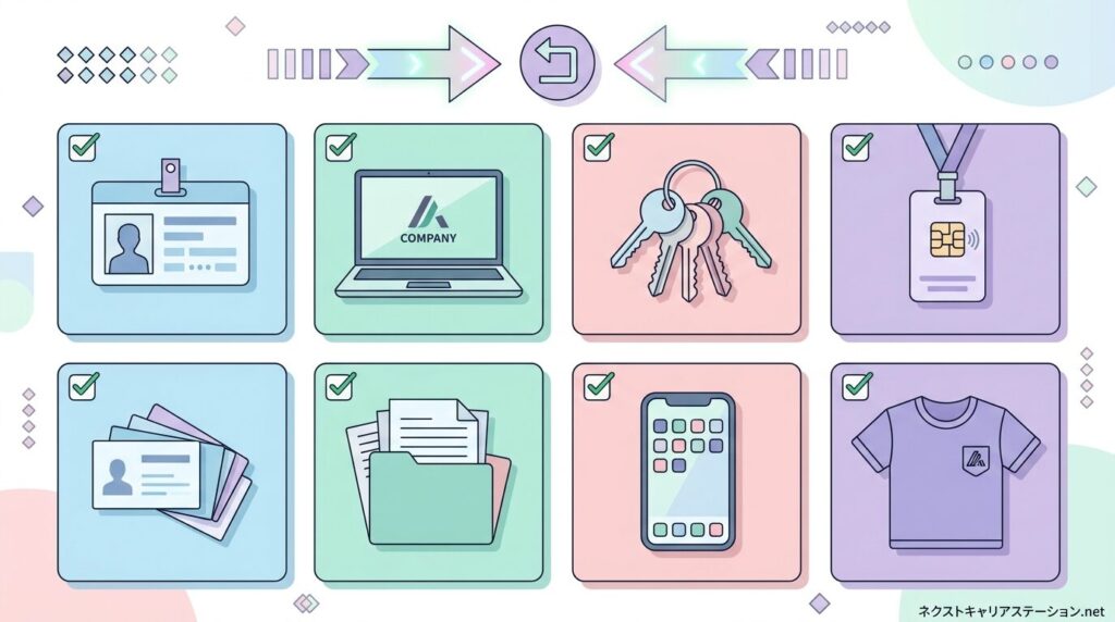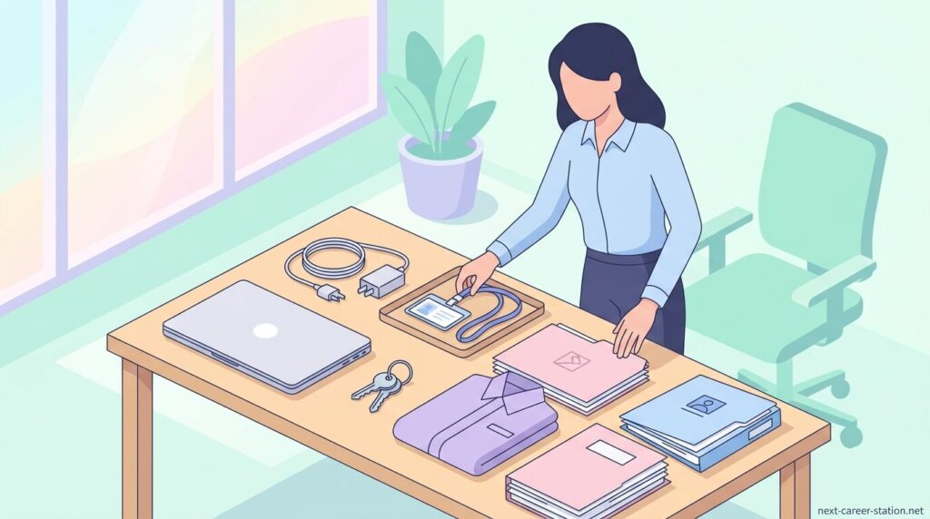 最終出社日に返却する物は、会社の施設や設備の利用に関係する物です。社員証、入館カード、社章、ロッカーの鍵、セキュリティカード、ノートPC、社用スマートフォンなどは最終出社日に総務または直属の上司へ手渡します。これらは退職後に会社へ入館したり業務用機器を使用したりできないよう管理する必要があるため、勤務が終わる最終日に回収されます。