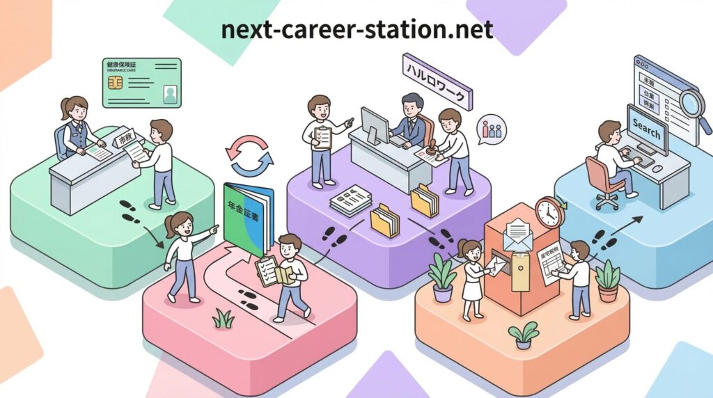 退職後にすぐ就職しない場合は、自分で健康保険と年金の手続きを行い、必要に応じて失業保険の申請を行います。退職日の翌日に会社の健康保険と厚生年金の資格が喪失するため、市区町村の窓口で国民健康保険への加入手続きと国民年金への種別変更手続きを行います。