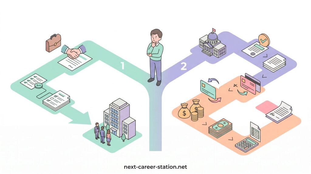 一方、退職後は市区町村で国民健康保険の加入手続きを行ったり、ハローワークで失業保険の申請をしたりと、自分で役所や窓口に行って進める手続きも出てきます。こうした流れを知らないまま退職してしまうと、「期限を過ぎてしまった」「必要な書類が足りない」といったトラブルにつながることもあります。