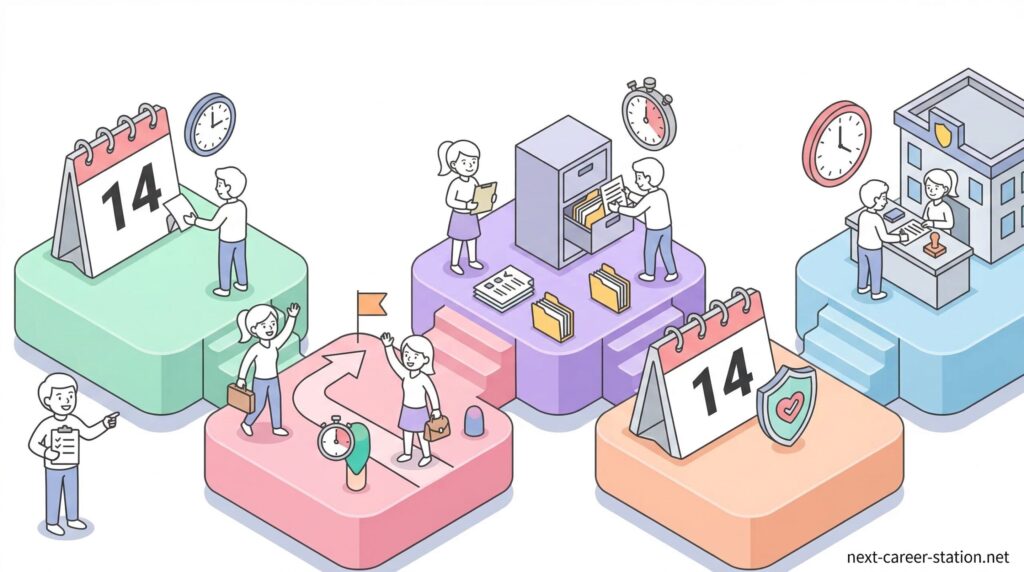 退職に関する手続きは、すべてを同じタイミングで行うわけではありません。健康保険や年金のように退職後14日以内に行うもの、離職票が届いてから進めるもの、さらに翌年になってから必要になる手続きもあります。