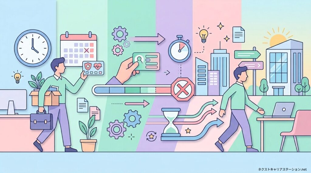 | 退職日当日 | 前職の健康保険資格が終了 | 保険証は返却対象/翌日以降は使用不可 | 月末・月途中に関係なく資格はその日で終了 |